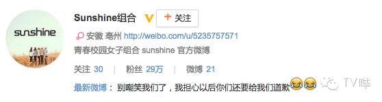 究竟引起争议的Sunshine如何出现的呢?搜索新浪微博,记者找到了最初的源头——微博大号“娱八婆”。娱八婆,国内著名音乐歌曲推广者之一、微博签约自媒体,传闻年收入百万,正是她爆料了sunshine组合即将在国内大红,目前你依然可以在她的置顶微博看到这条已经被转发评论超过10万的内容,记者联系到这位神秘的微博大号他向我们解释了这场“意外”的缘由。